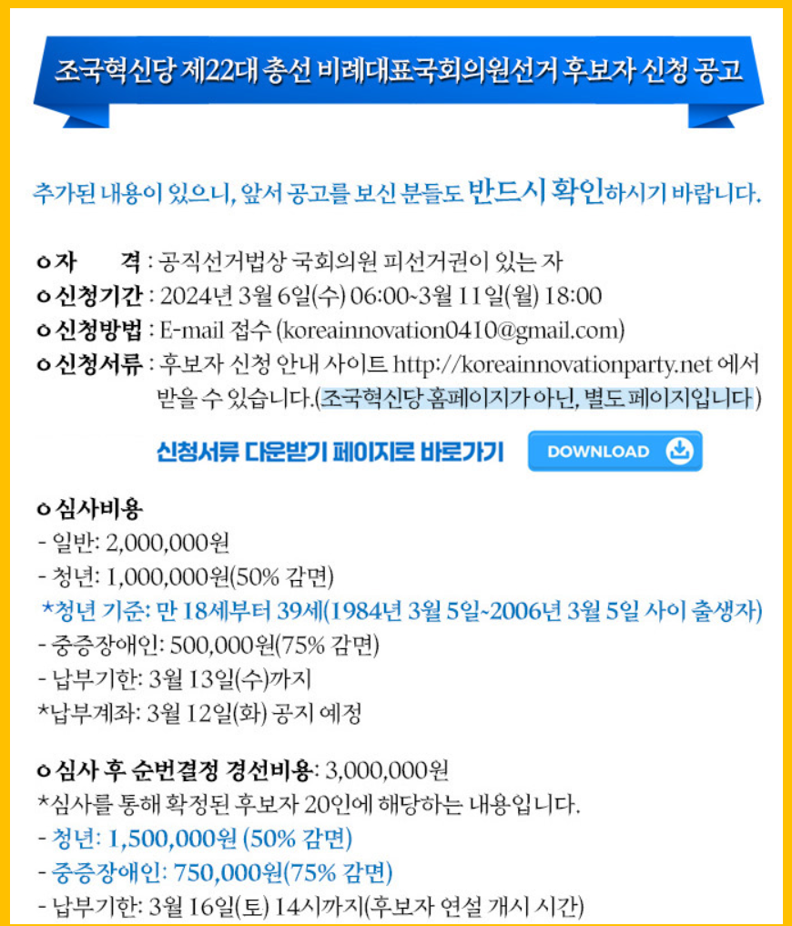 조국혁신당 제22대 총선 비례대표국회의원선거 후보자 신청공고