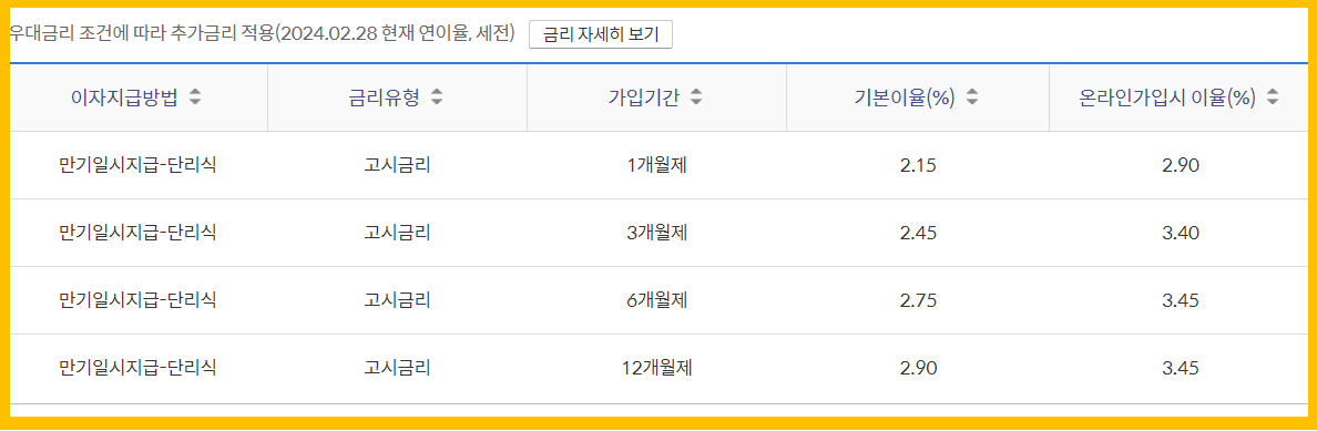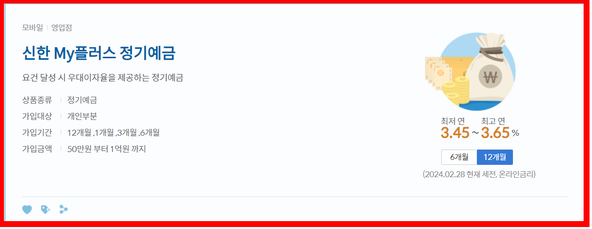 - 예금 보유기간 동안 신한 은행 입출금 계좌에 50만원 이상 입금시 0.1% 추가