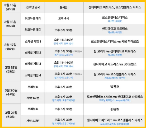 3월 17일에는 LA 다저스 대 키움 히어로즈, 3월 18일에는 샌디에이고 파드리스 대 LG 트윈스 등의 경기가 열릴 예정입니다.